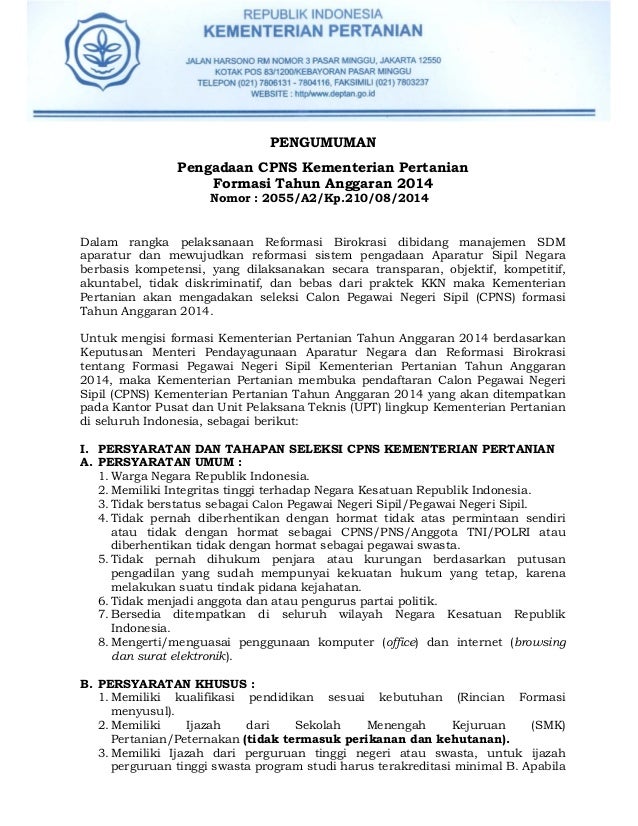 Buka 520 formasi cpns 2019 ini yang dibutuhkan kementerian pertanian kabar24 bisnis com. Kementerian pertanian republik indonesia dipimpin oleh seorang menteri pertanian. Kelulusan pelamar adalah prestasi pelamar sendiri. Karena sangat banyak dari pendaftar yang tidak sampai pada tahap ini, bukan karena tidak bisa, tetapi mungkin karena persyaratan yang kurang lengkap saja. Pelamar harus membaca dengan cermat pengumuman, memenuhi semua persyaratan dan melakukan pendaftaran sesuai dengan tata cara yang termuat dalam pengumuman